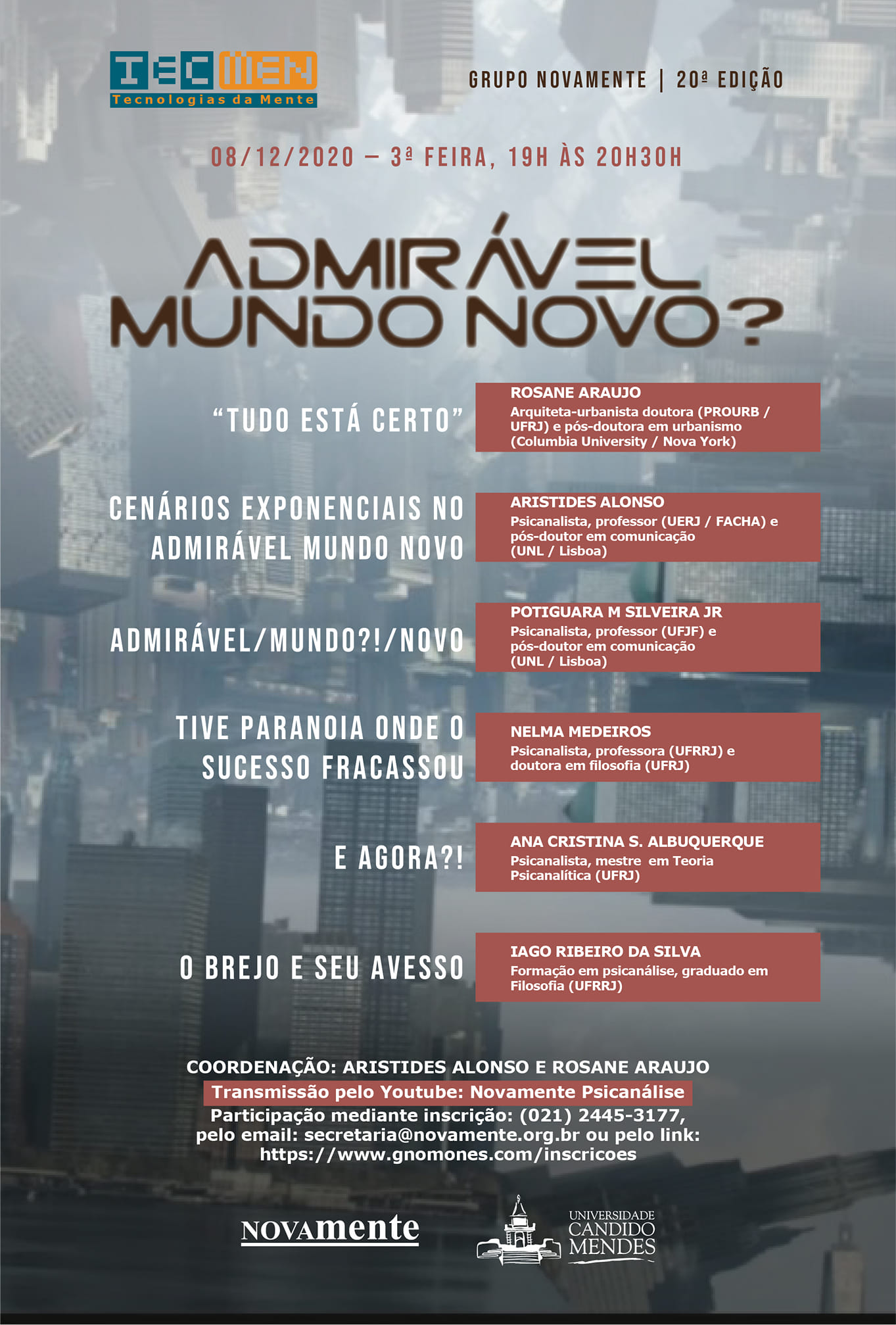 | Vídeo da live do 20o Encontro do “TecMen: Tecnologias da Mente”, 08 dezembro 2020. Disponível no Canal “Psicanálise NovaMente”, no YouYube |